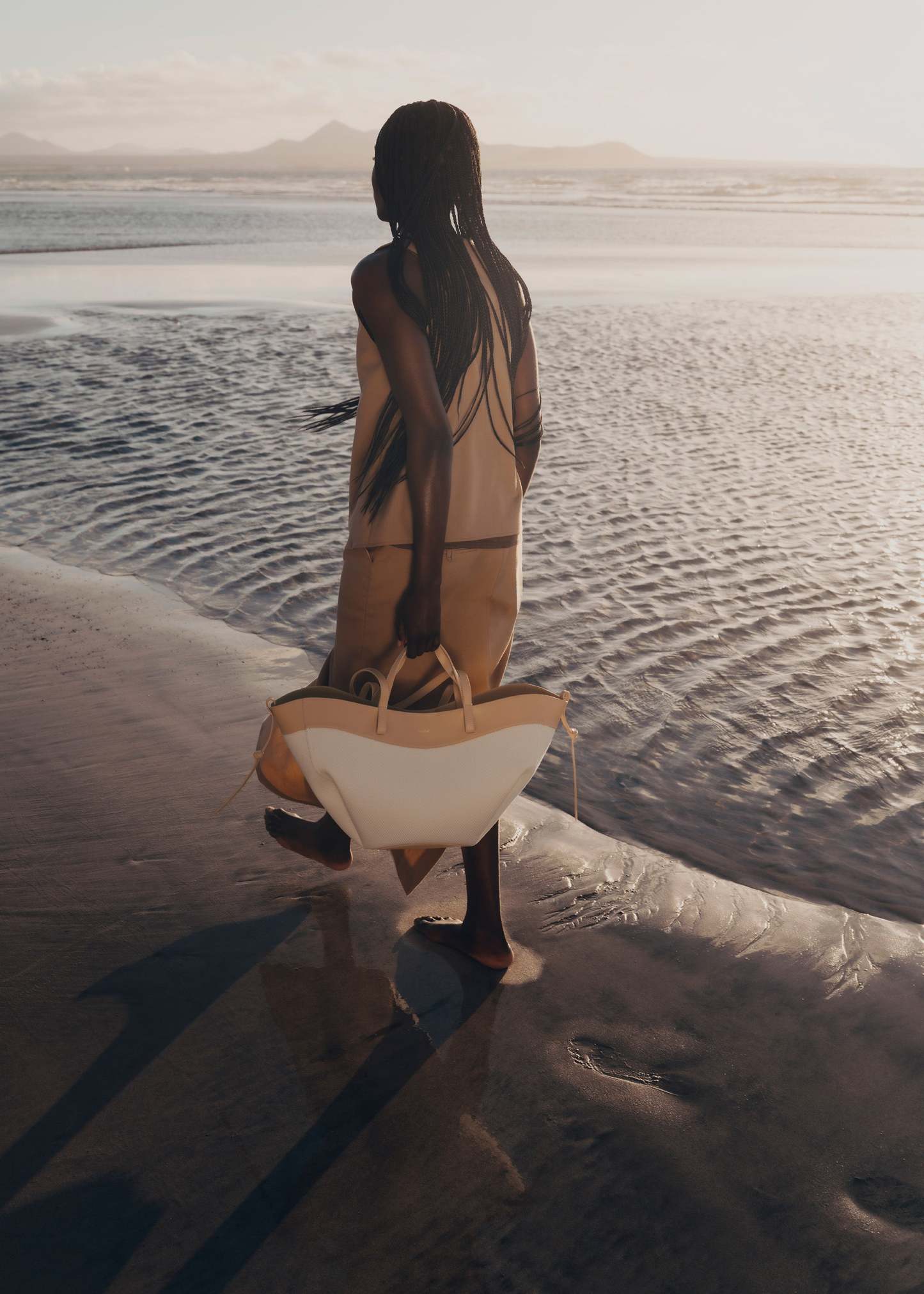 This sculptured tote bag featuring waves, folds, and curves can be used in two ways. Basket-style, with its sides open and straps on the outside, or As a flower-like closed bag, with its sides tucked in and its straps crossed on the inside.