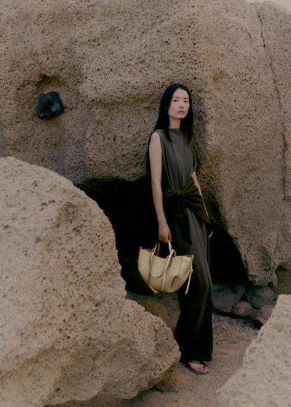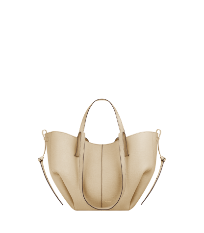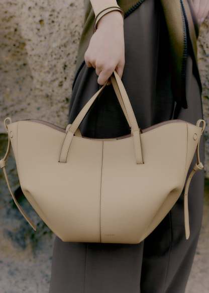 This sculptured compact tote bag featuring waves, folds, and curves can be used in two ways. Basket-style, with its sides open and straps on the outside, or As a flower-like closed bag, with its sides tucked in and its straps crossed on the inside.