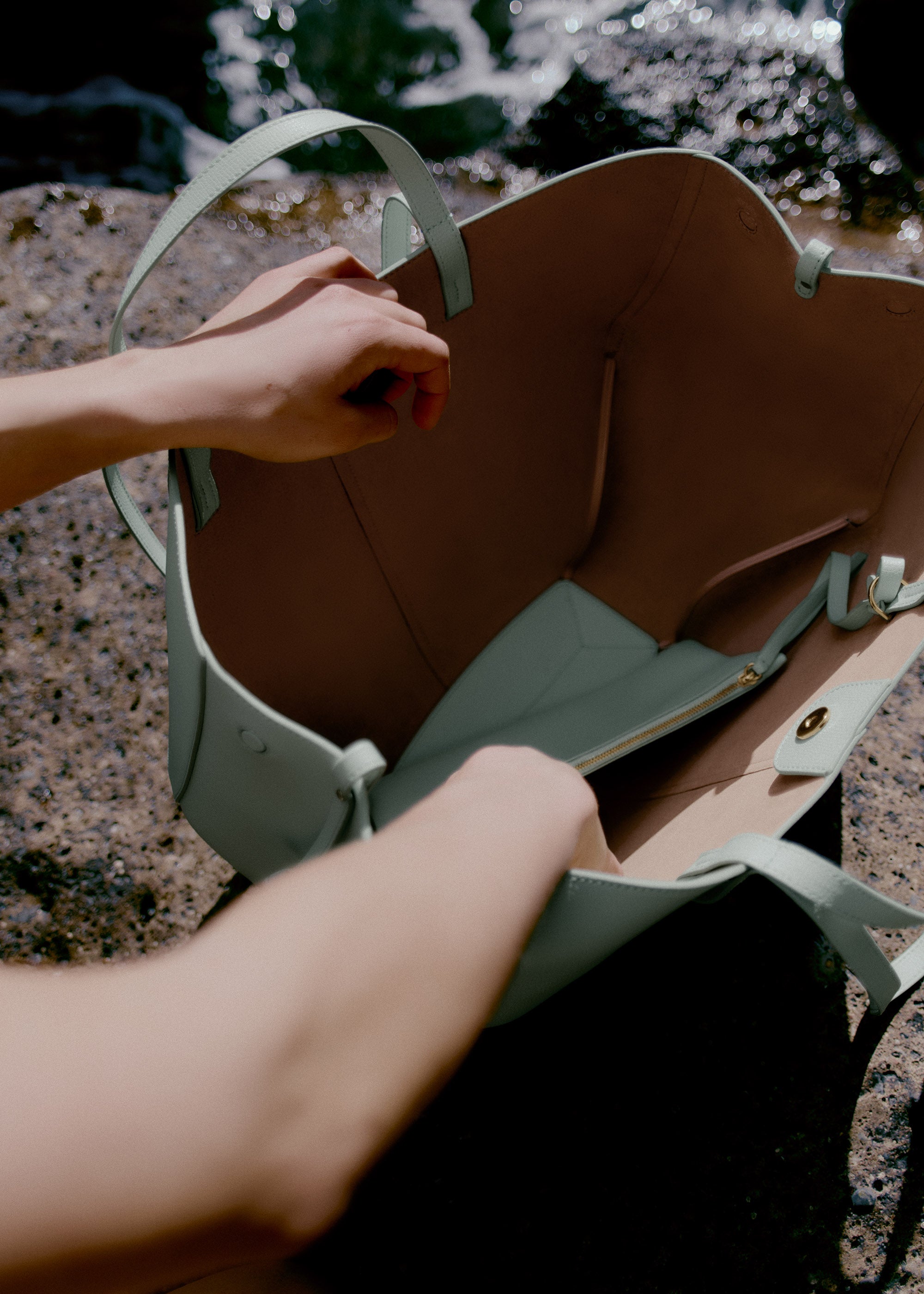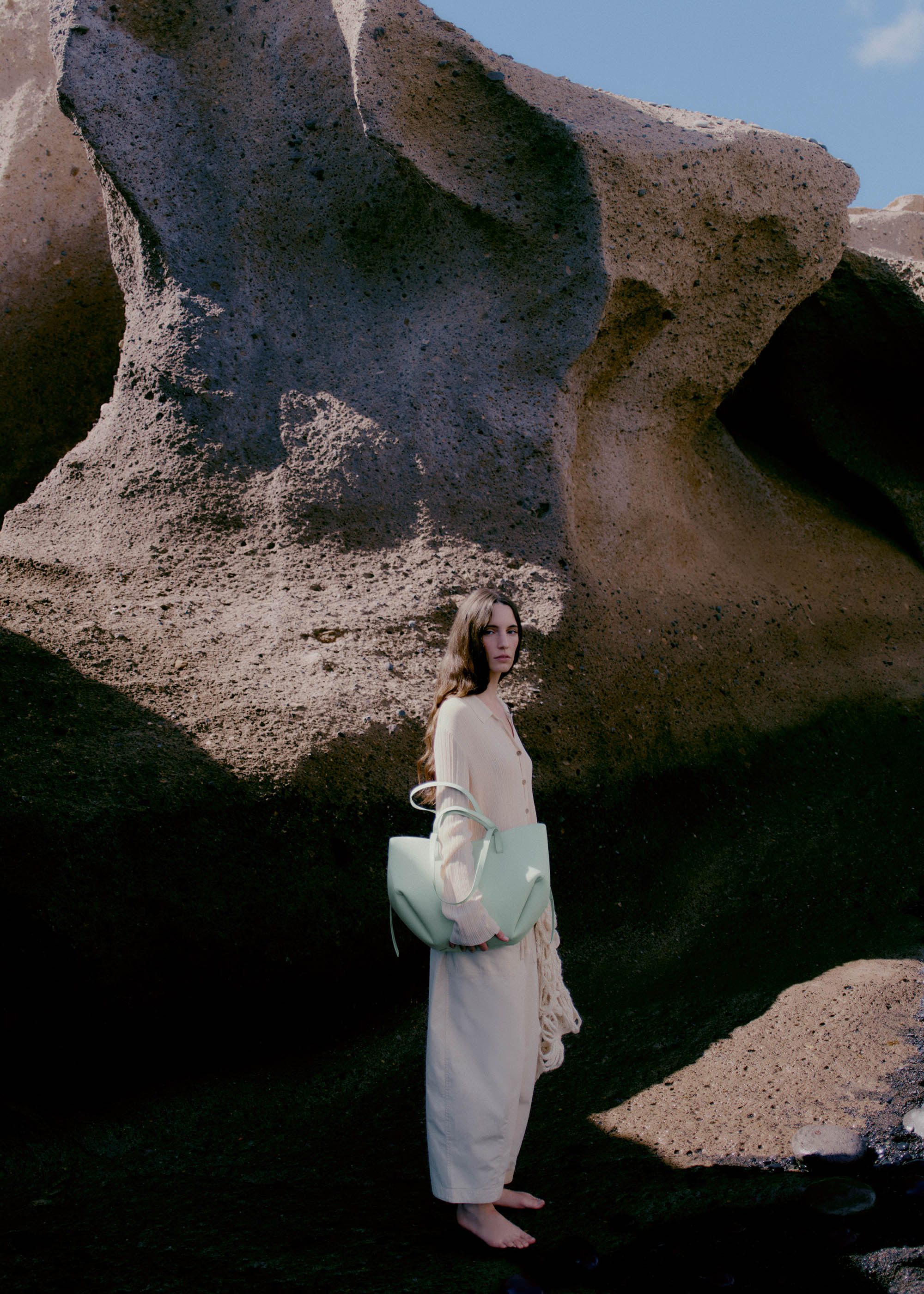 This sculptured tote bag featuring waves, folds, and curves can be used in two ways. Basket-style, with its sides open and straps on the outside, or As a flower-like closed bag, with its sides tucked in and its straps crossed on the inside.