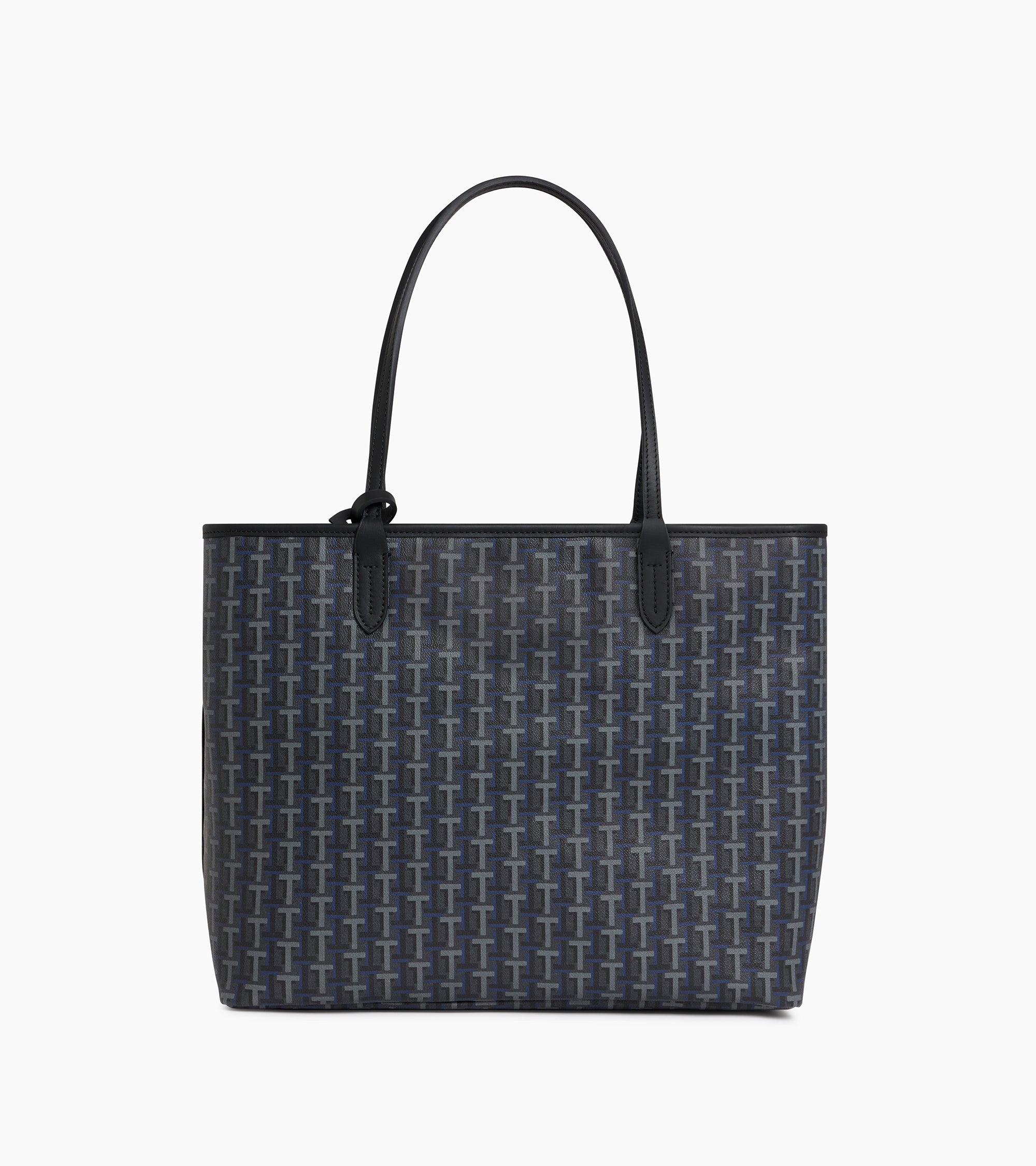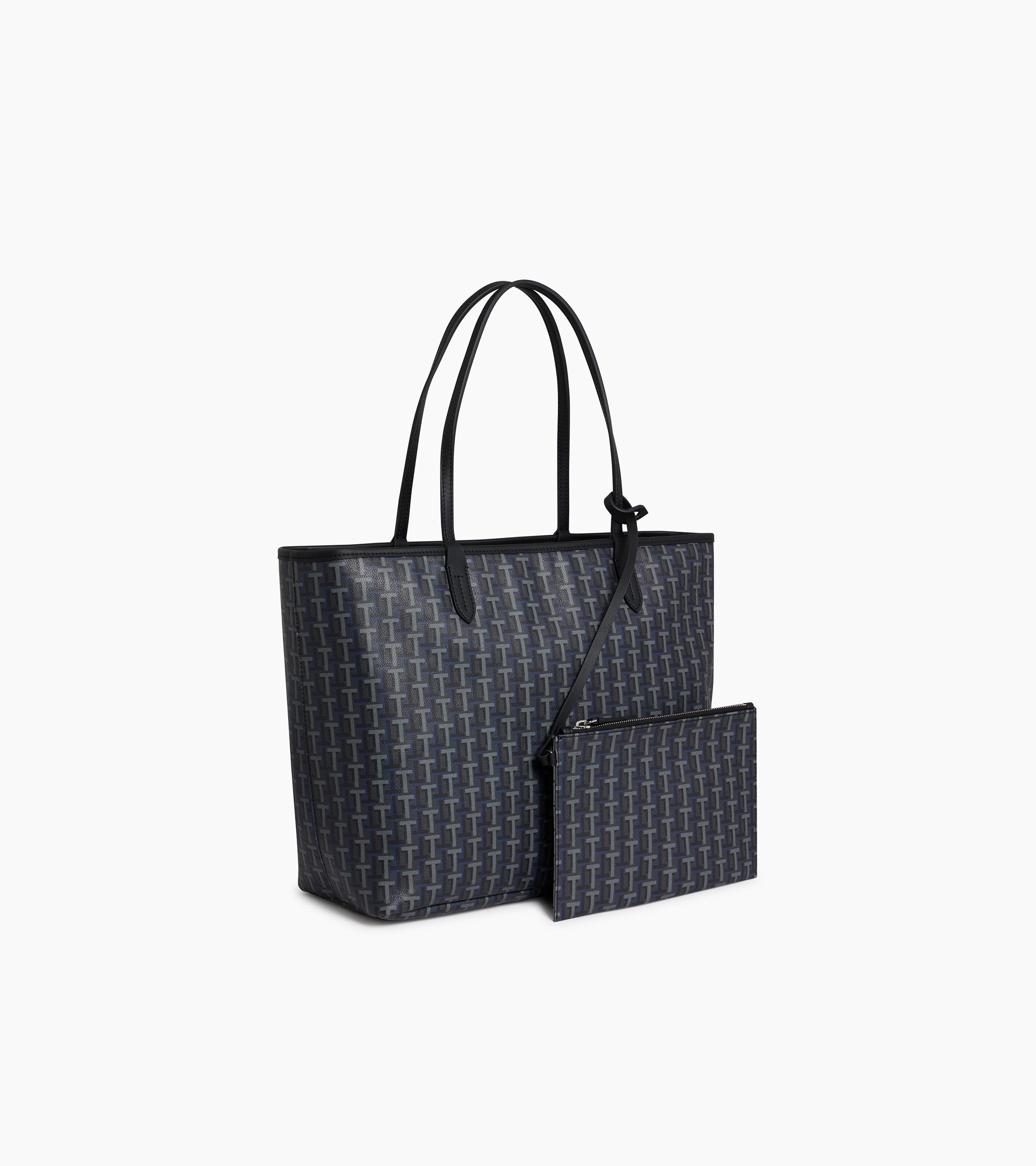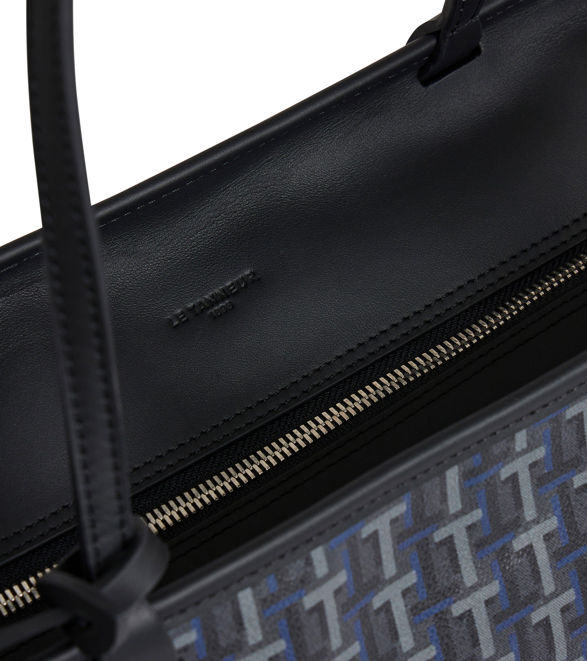 Cabas en cuir et toile de coton enduite ornée d’un motif signature T. Ce grand modèle comporte des poignées patte ogive, piquées elles aussi en T. Se porte à l’épaule. Peut contenir un ordinateur 16".