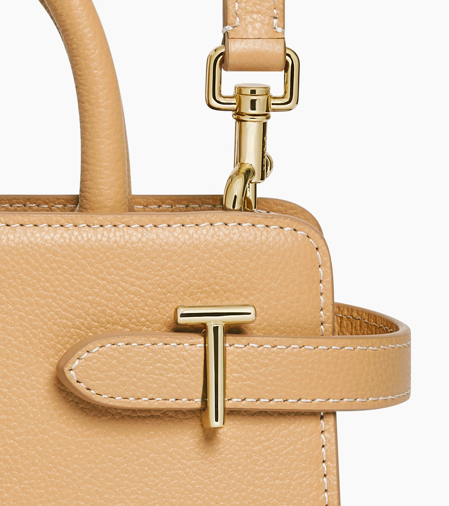 Petit sac à main avec poignées toron et trois compartiments dont un zippé. Pièces T métalliques signature de la ligne. Charms embossé Le Tanneur amovible. Porté main, épaule ou croisé grâce à sa bandoulière ajustable et amovible.