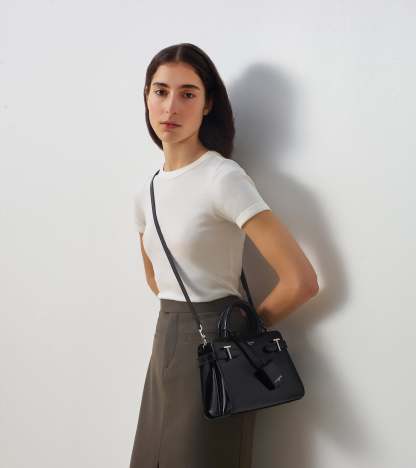 Sac à main petit modèle avec double T signature, charms amovible et doublure jacquard anniversaire. Marquage Le Tanneur et éléments métalliques finition argent. Porté main, épaule ou croisé grâce à sa bandoulière ajustable et amovible.