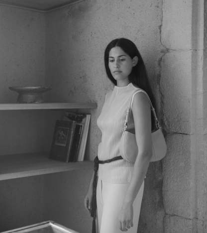 Petit sac demi-lune avec doublure jacquard crépuscule et marquage Le Tanneur. Double porté grâce à sa mini bandoulière porté épaule amovible et sa bandoulière porté croisé ajustable et amovible.
