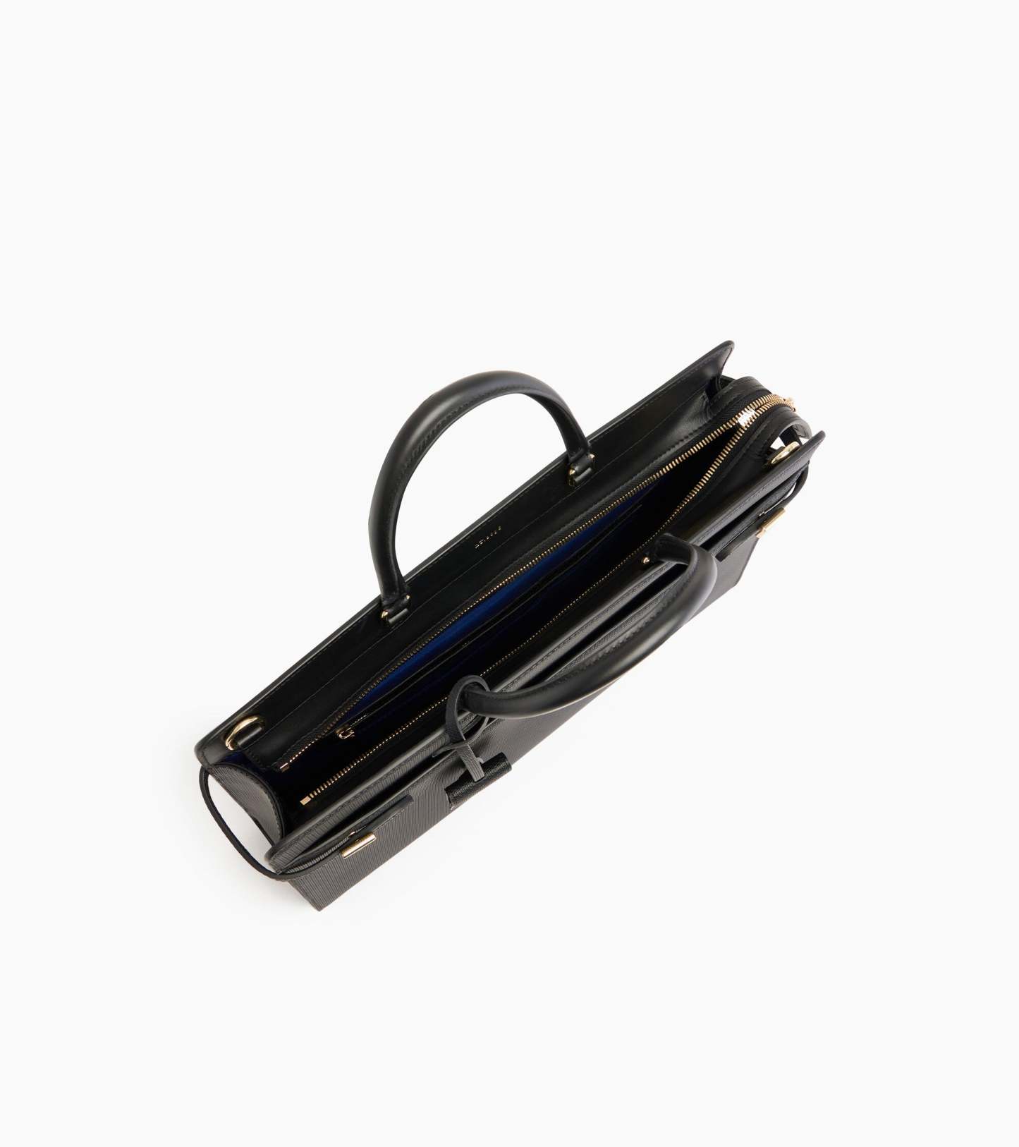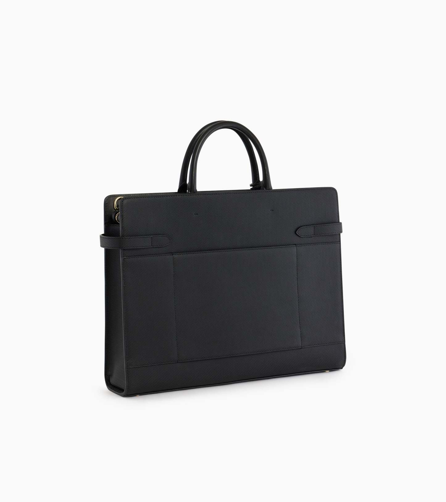 Porte-documents avec poche ordinateur, passant trolley, fermoirs T signature et marquage Le Tanneur. Porte-étiquette amovible. Porté main, épaule ou croisé grâce à sa bandoulière ajustable et amovible.
