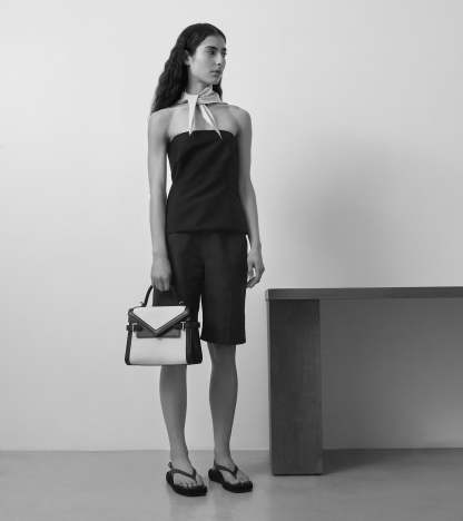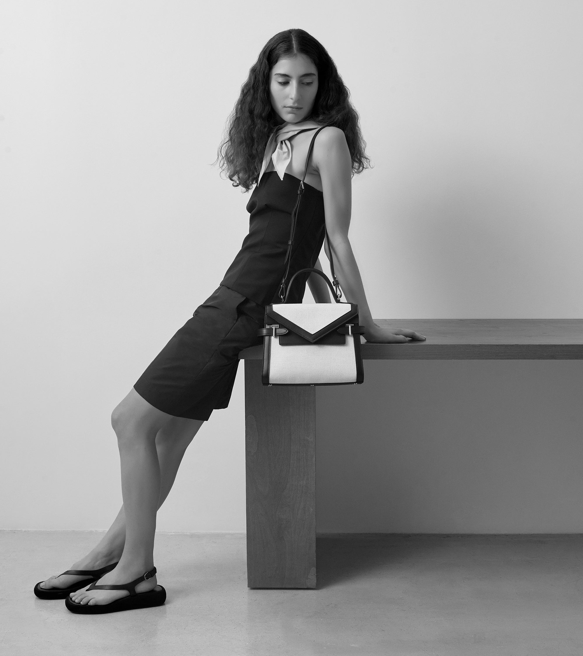 Sac à main bi-matière moyen modèle avec double rabat, double T métallique signature, charms amovible et doublure jacquard anniversaire. Marquage Le Tanneur embossé ton sur ton. Porté main, épaule ou croisé grâce à sa bandoulière ajustable et amovible.