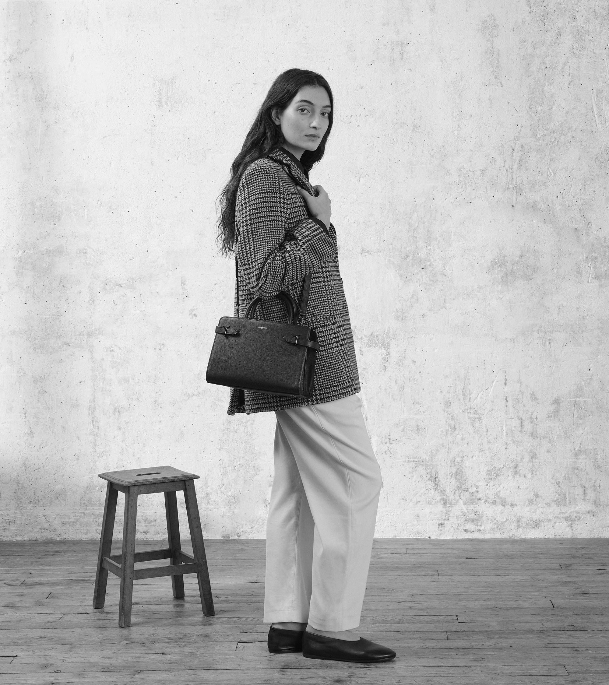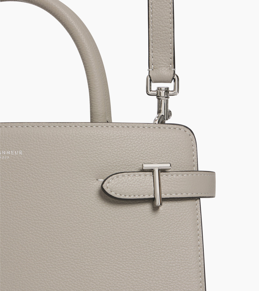 Sac à main moyen modèle avec poignées toron et trois compartiments dont un zippé. Pièces T métalliques signature de la ligne. Charms embossé Le Tanneur amovible. Porté main, épaule ou croisé grâce à sa bandoulière ajustable et amovible.