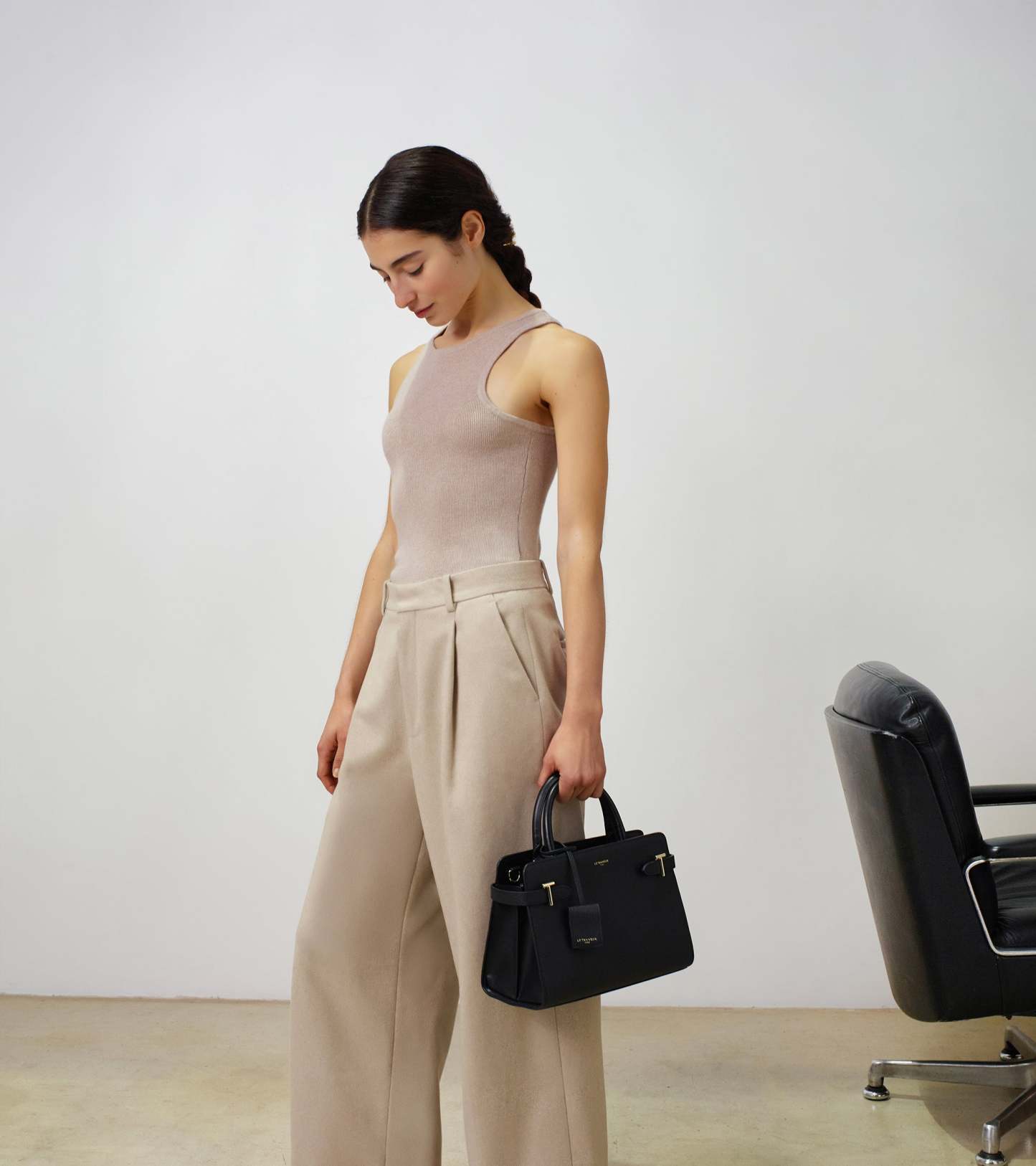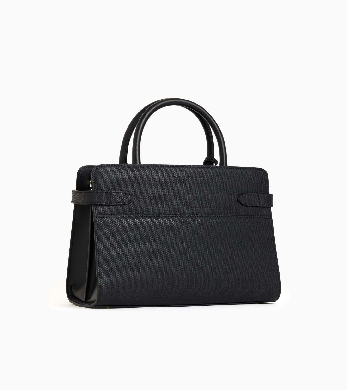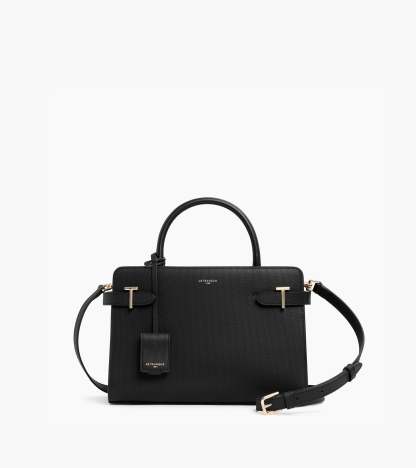 Sac à main moyen modèle rigide arbore les fermoirs T de la Maison. Il dispose de patins de protection et d'un charms amovible. Portez-le à la main, à l'épaule ou croisé grâce à sa bandoulière amovible ajustable.