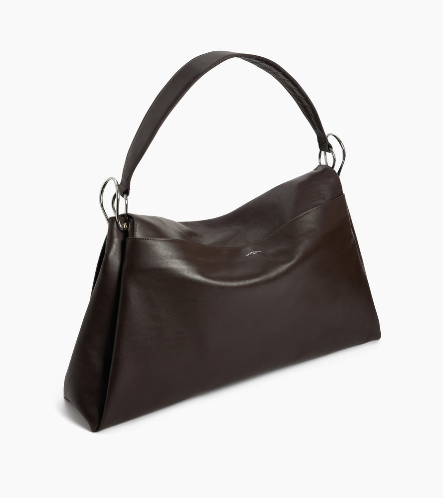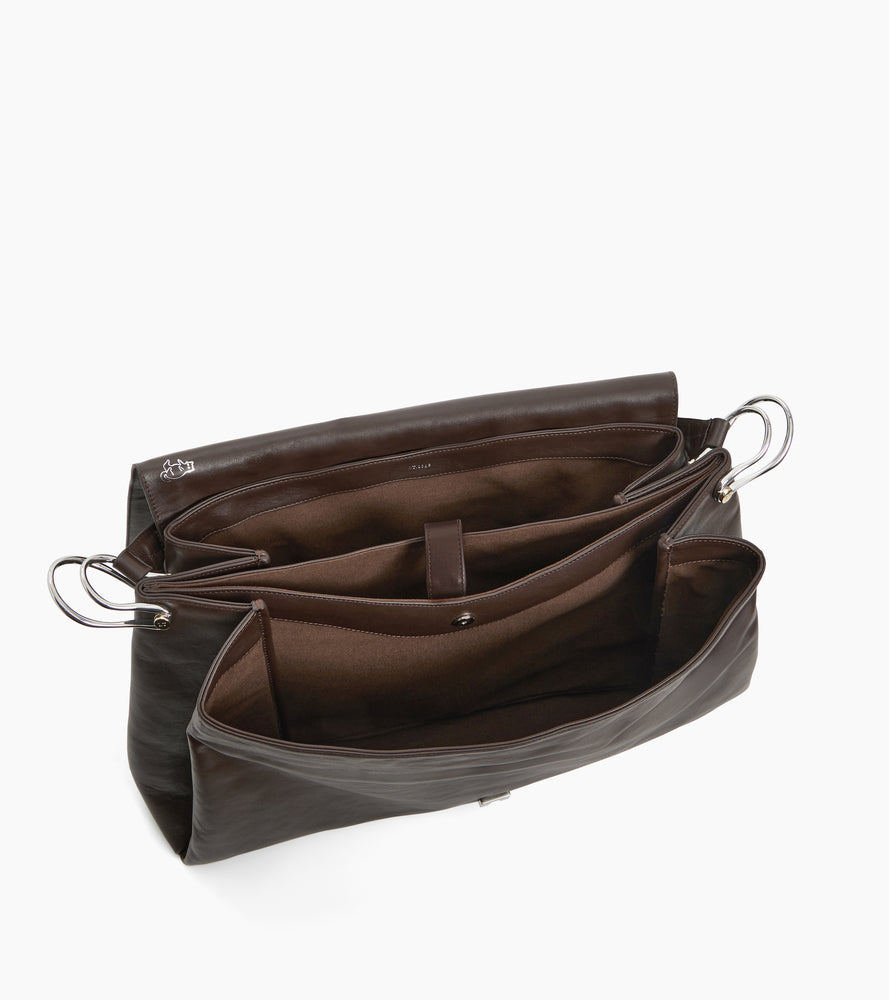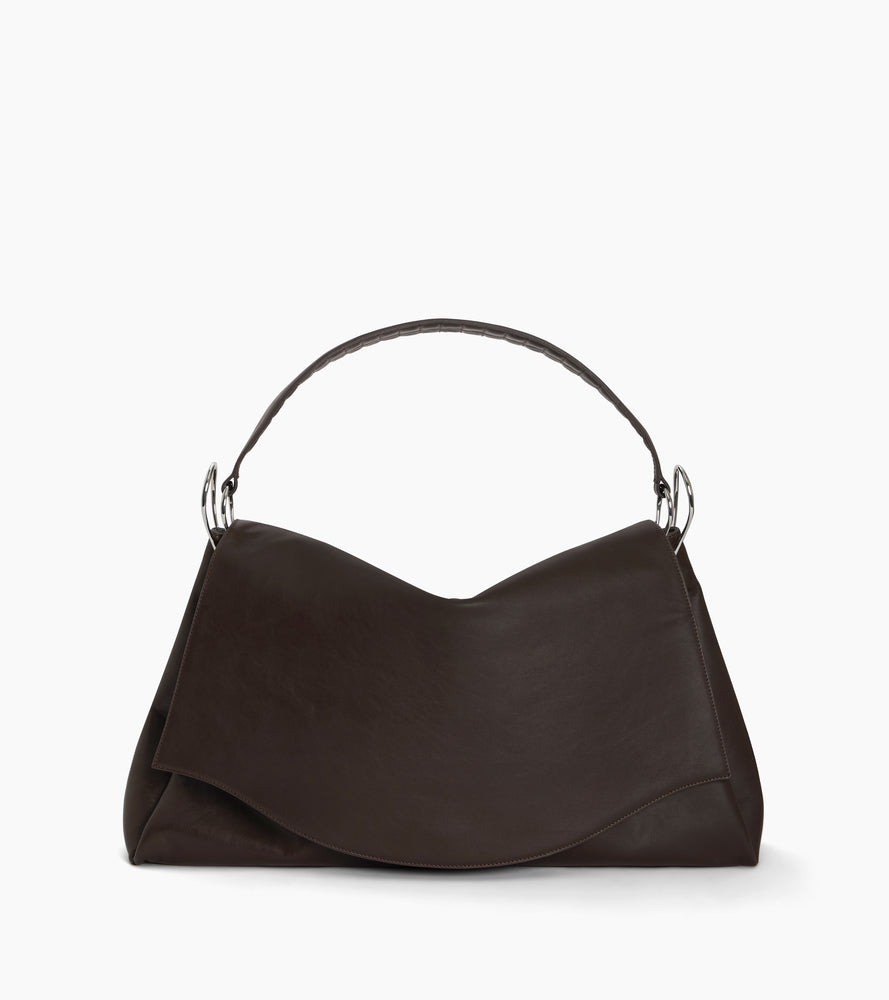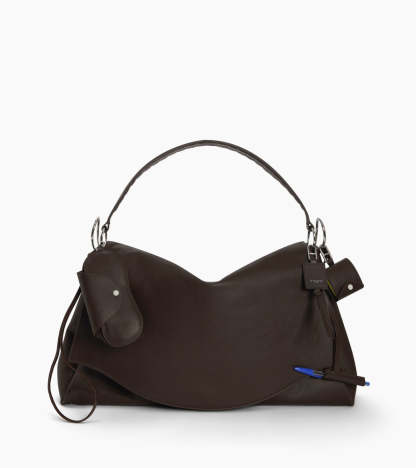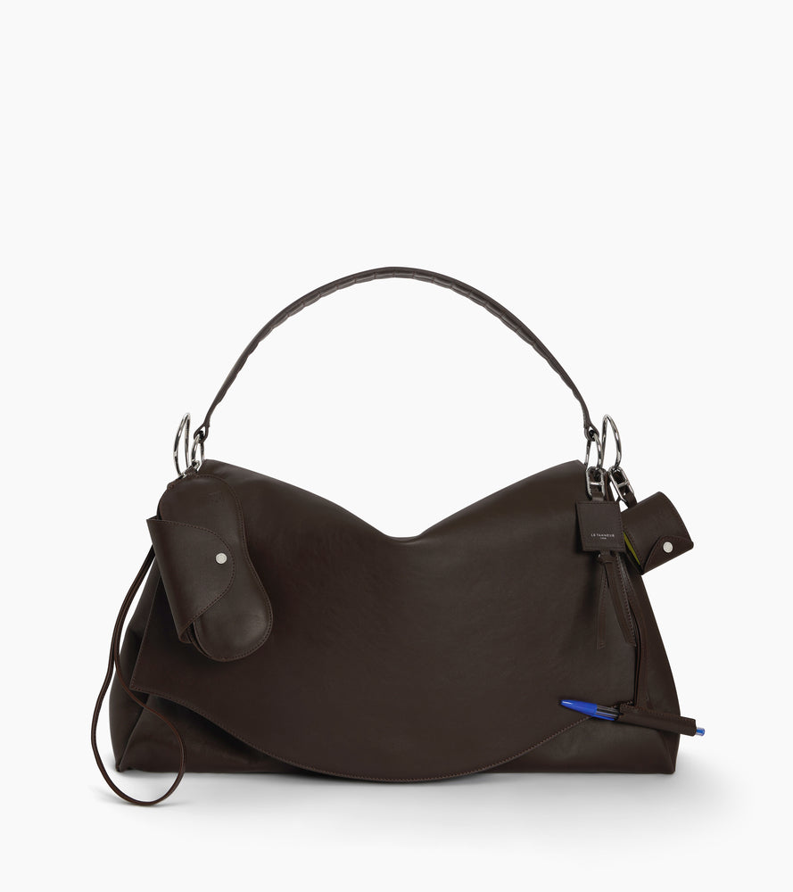 Sac à main souple maxi Le Grand Jean avec marquage signature « Jean le chat » sur film argent et éléments métalliques finition argent. Double porté épaule ou croisé grâce à sa bandoulière courte et sa bandoulière longue ajustable et amovible. Les charms ne sont pas vendus avec le sac. Peut contenir un ordinateur 17".